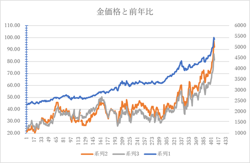以下のチャートは青線の系列1がドル建て金価格、オレンジ色の線がその前年比、シルバーの線は為替や金利を除いた前年比です。