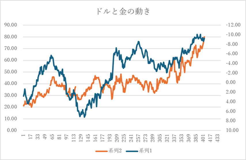 まず、ドル安から金高が起こっているので、ドルが安くなれば金は上昇するというのがキホンです。