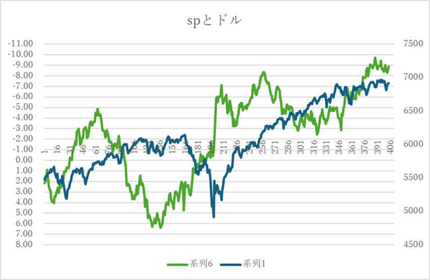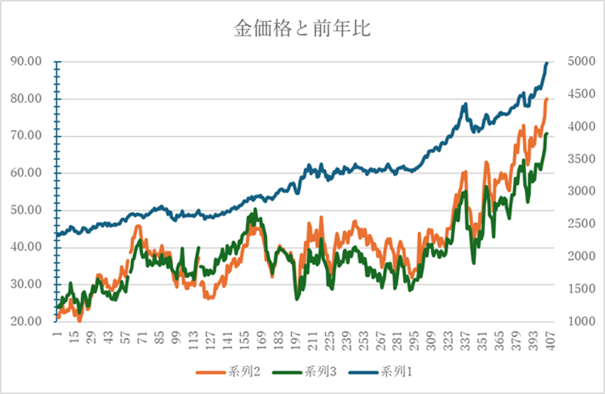 今回の場合、右端の方、オレンジ線の金の年間比が上昇するということは、本来は青線のドルインデックスの年間比はもっと上昇しなければいけません。