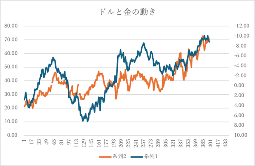下記は2024年7月1日〜2026年1月15日のドルの前年比を青線で系列1(右軸、反転)、金の前年比をオレンジ線で表しています。