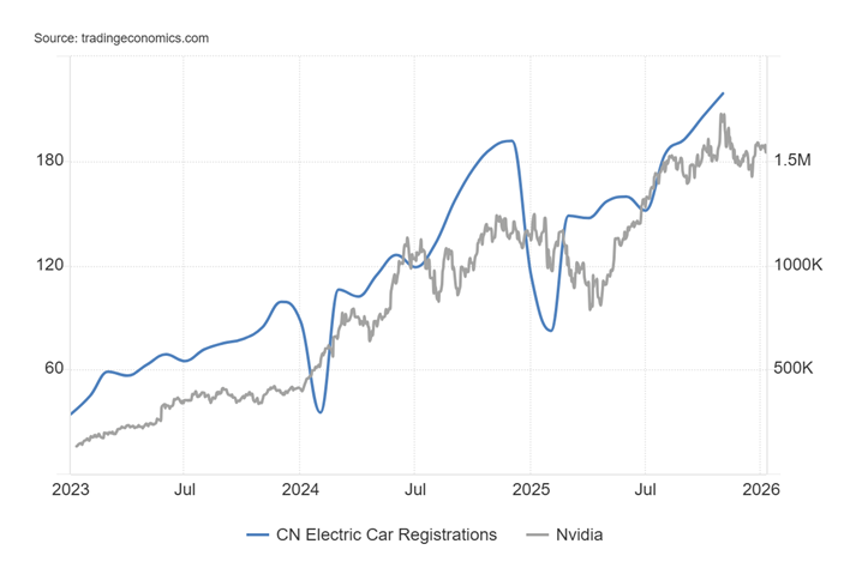 中国でEV販売台数が落ち込めば、NVDAの株価も落ちていることが確認できます。