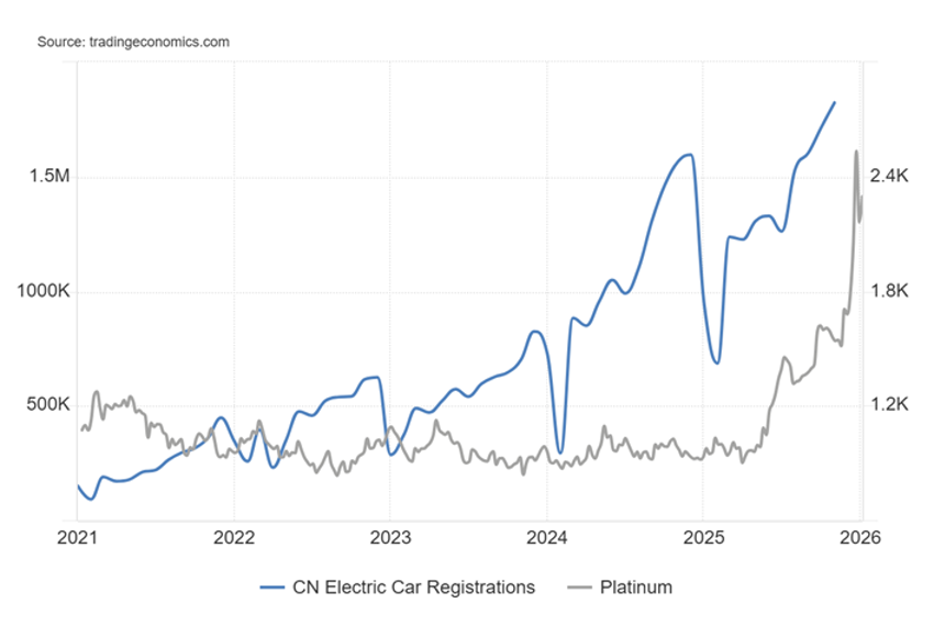 青線で中国における電気自動車(EV)販売台数、グレーの線で白金の価格を表したグラフをご覧ください。